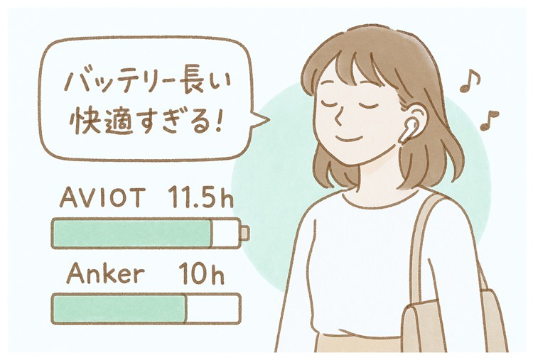 イヤホン単体だけで最大11.5時間再生できるというのも、AVIOT TE-Q3の見逃せない魅力のひとつです。