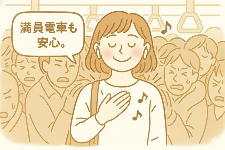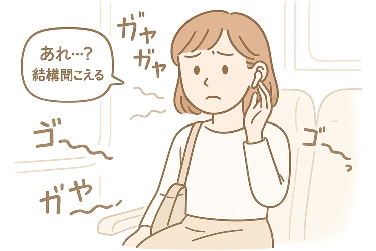電車の「ゴーーッ」という走行音のような低い騒音は少し和らげてくれますが、人の話し声や車内アナウンスは、普通に聞こえてきます。