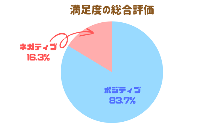 今回分析した98件の口コミでは、最終的に84%もの方が「満足した」と回答していて、総合評価は非常に高いことが分かります。