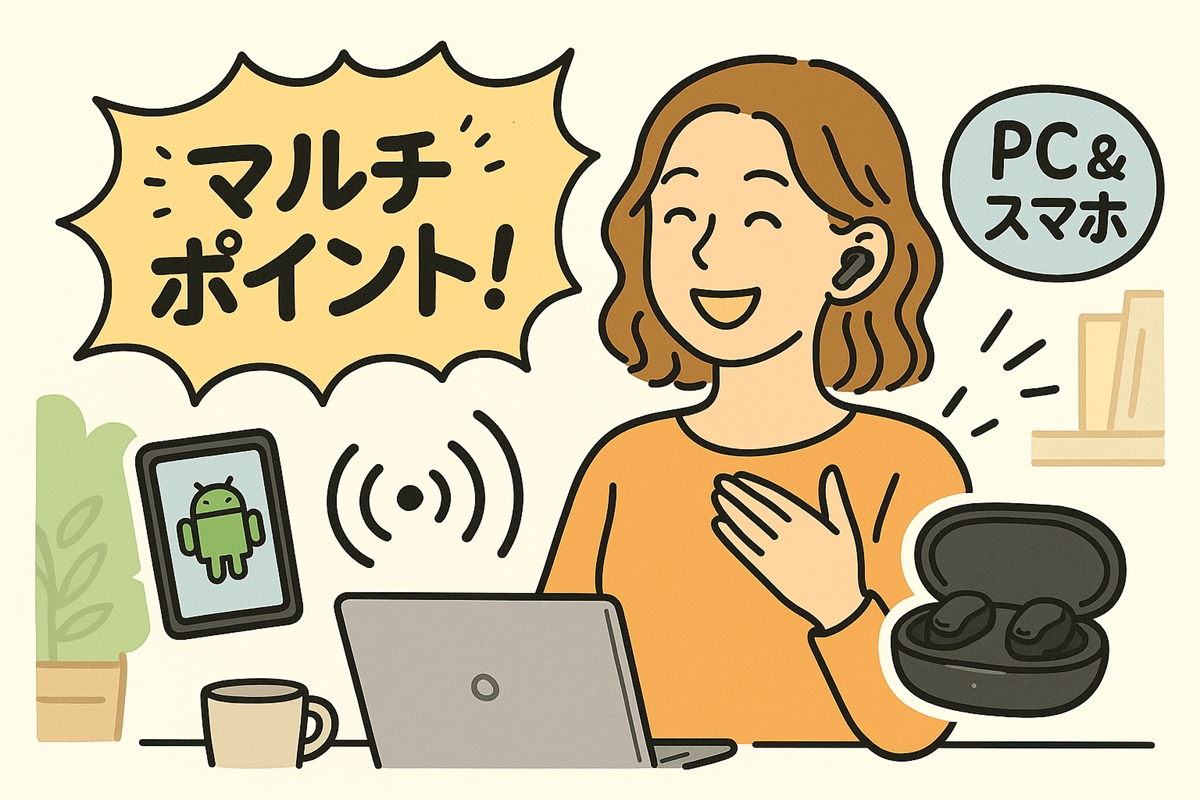 仕事用のPCで作業をしながら、個人のスマホも気になる…なんてこと、よくありますよね。そんなあなたのちょっとしたストレスを解消してくれるのが、この「マルチポイント」という機能なんです。